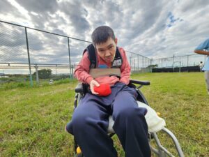 利用者さんが袋を叩いてピンポン球を飛ばして職員がキャッチします。