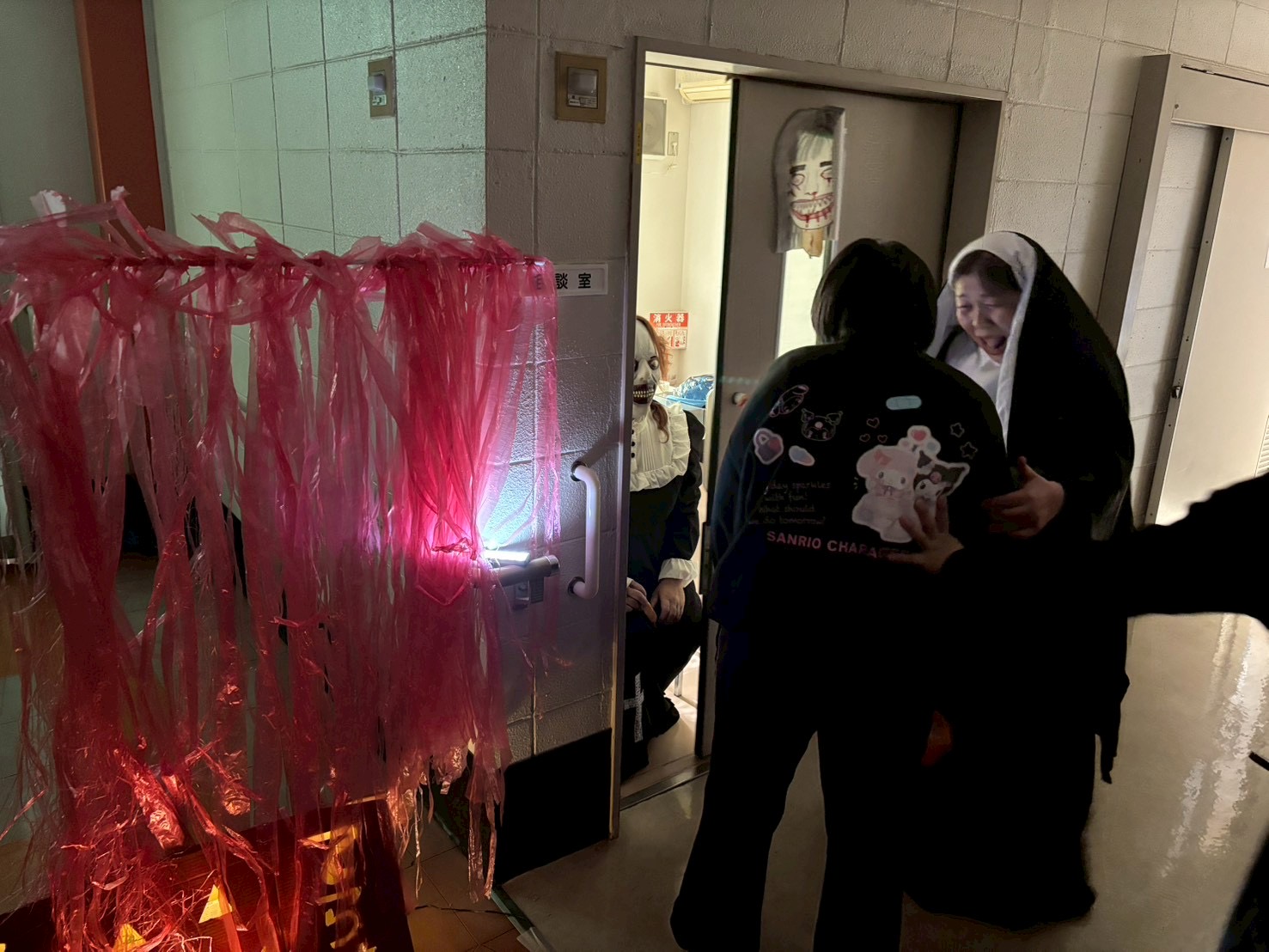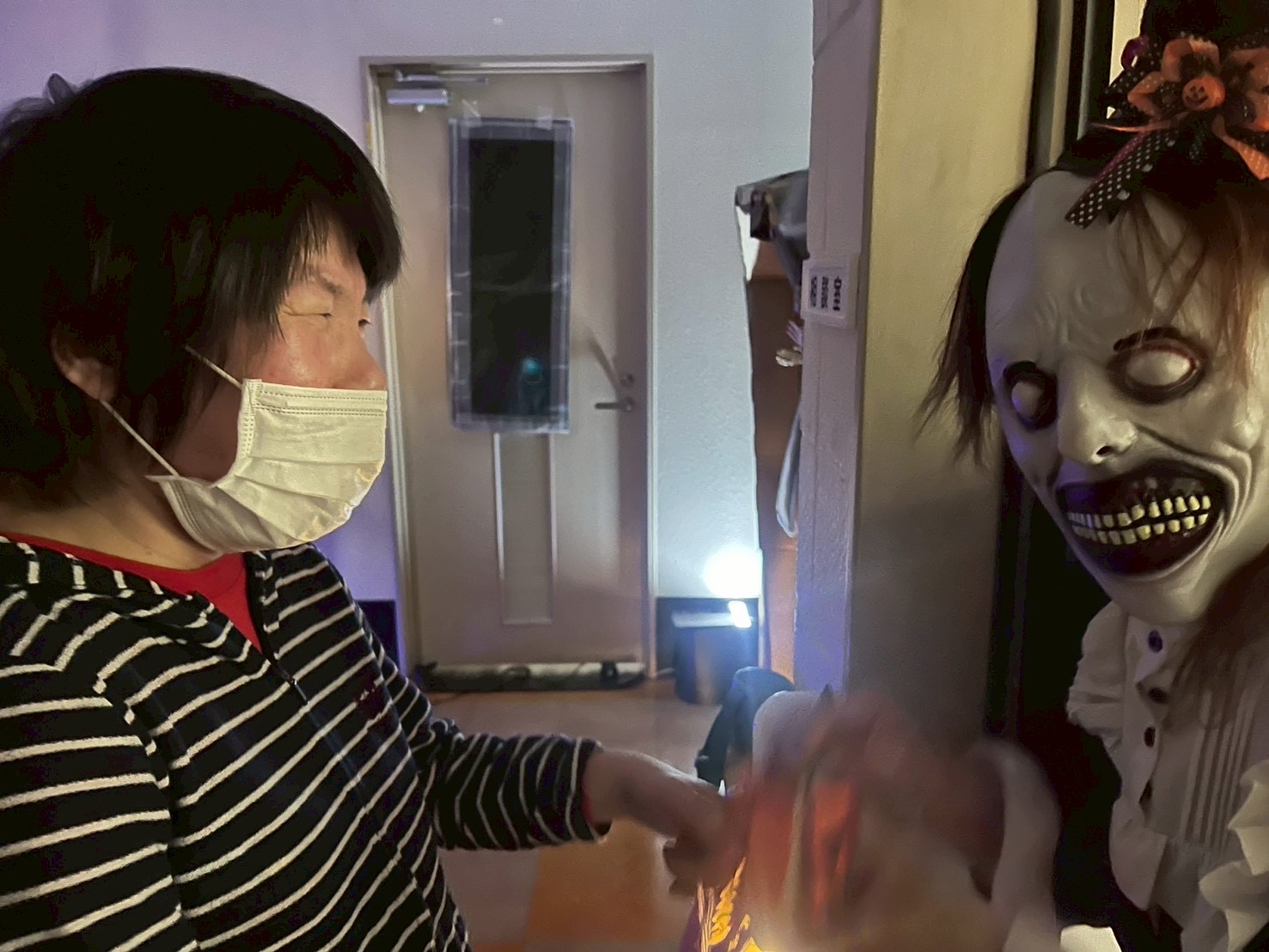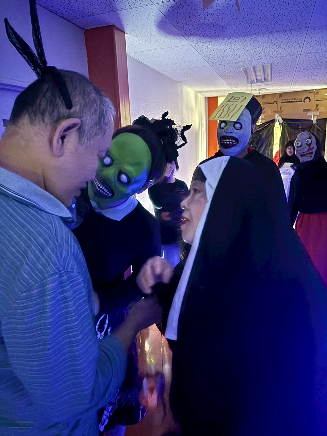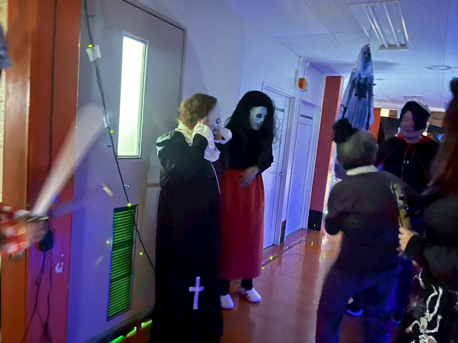手作りのかぼちゃバックとお菓子チケットを手に、お菓子を貰いにゾンビの館を進んでいきます👻👻