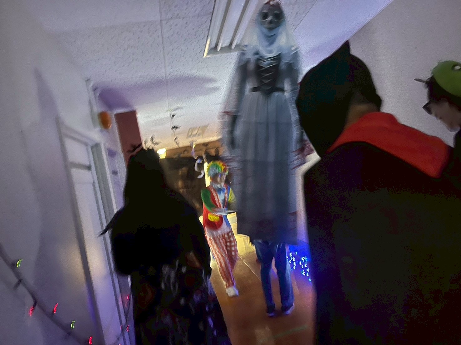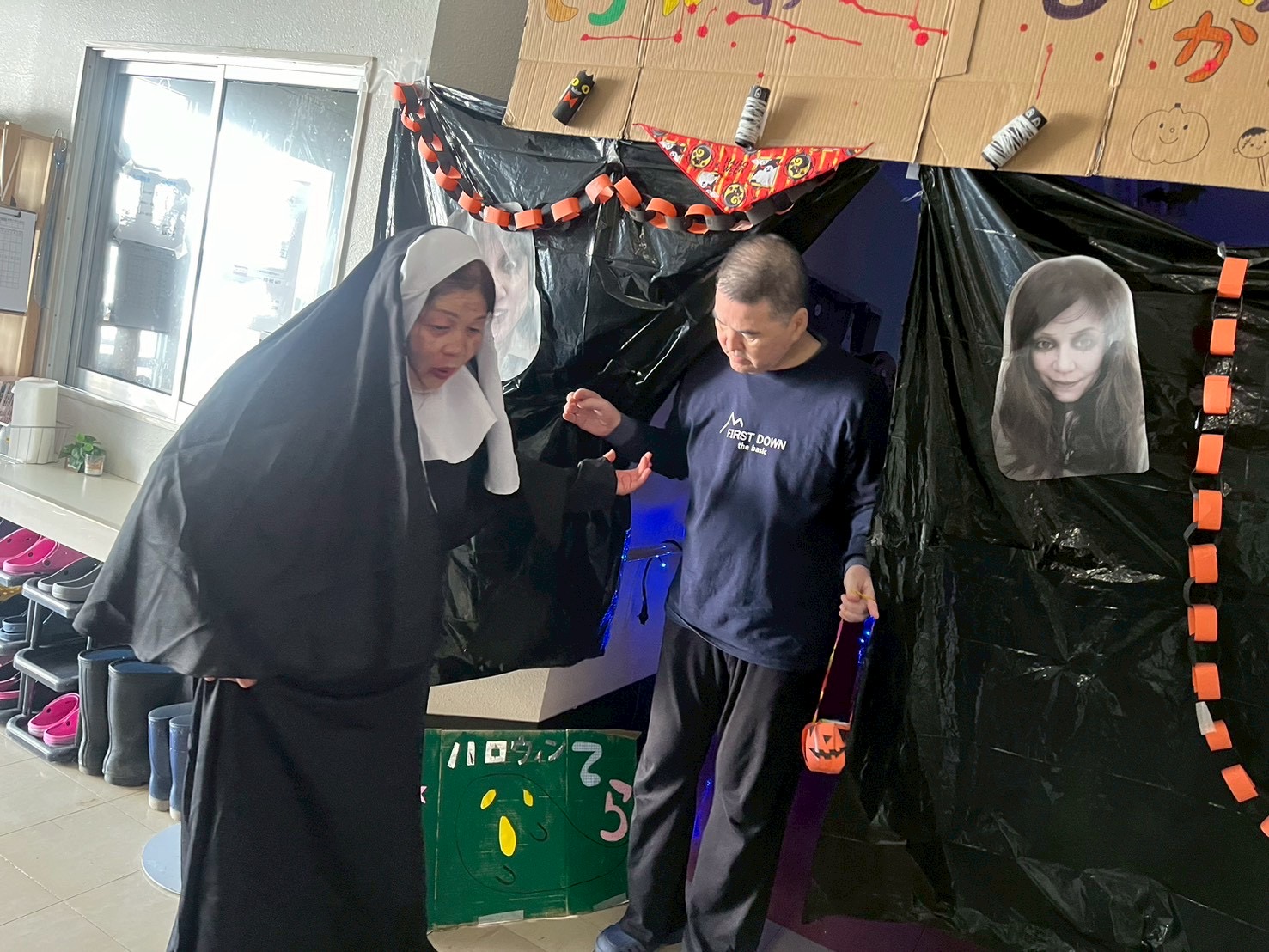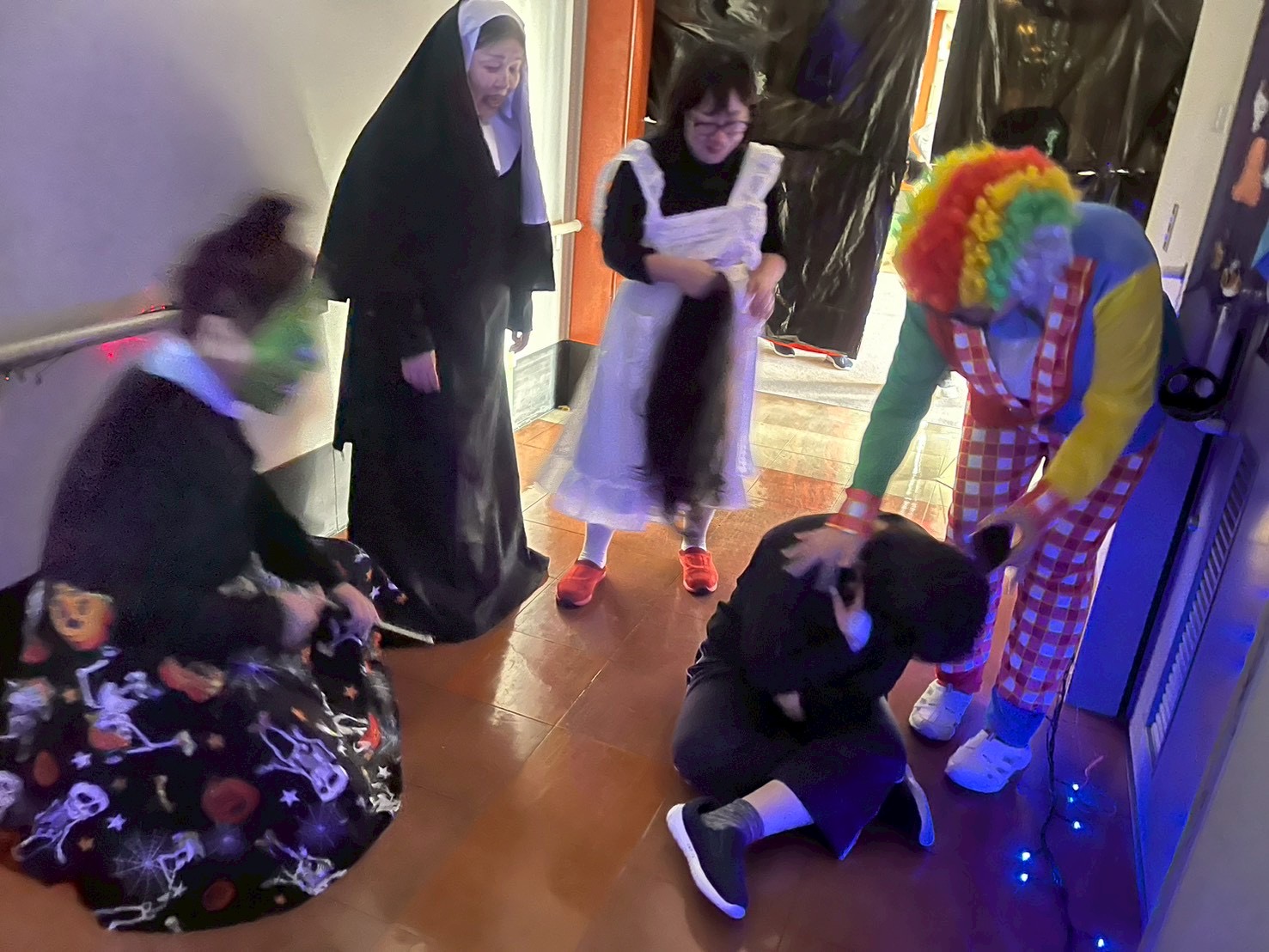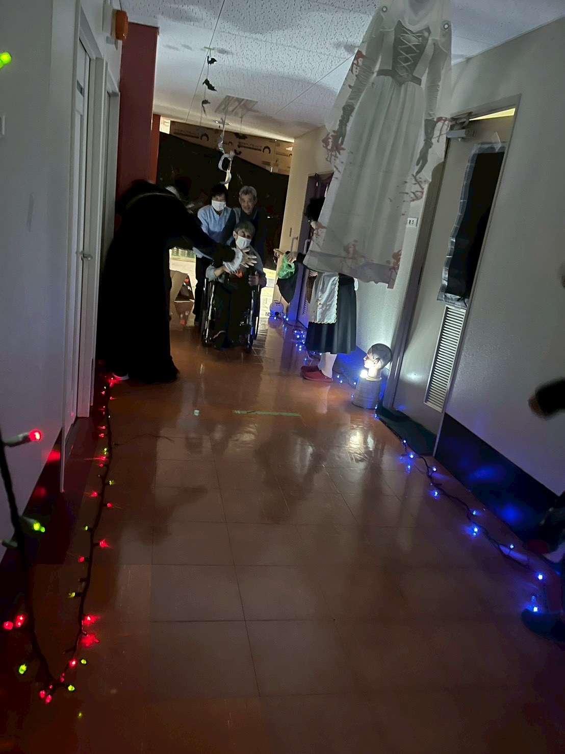 手作りのかぼちゃバックとお菓子チケットを手に、お菓子を貰いにゾンビの館を進んでいきます👻👻