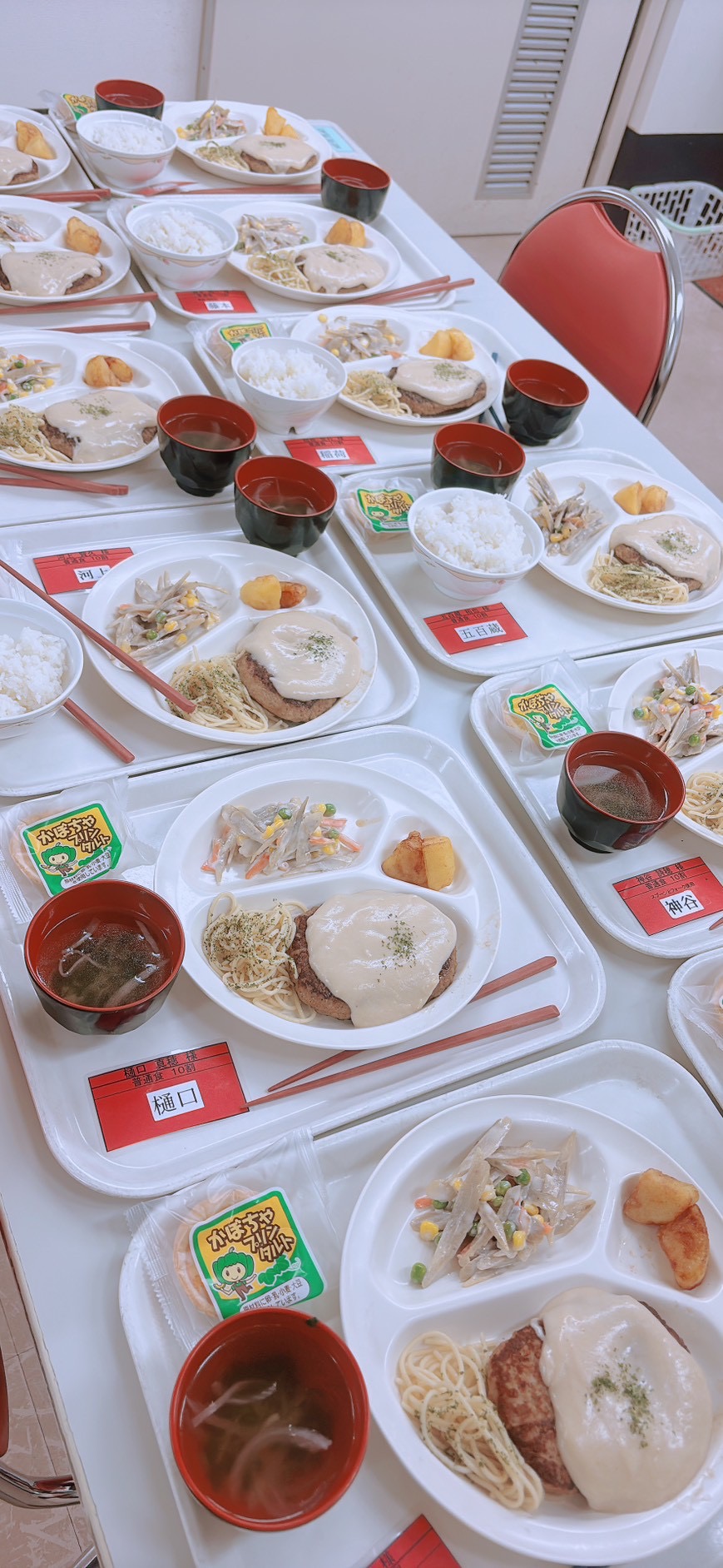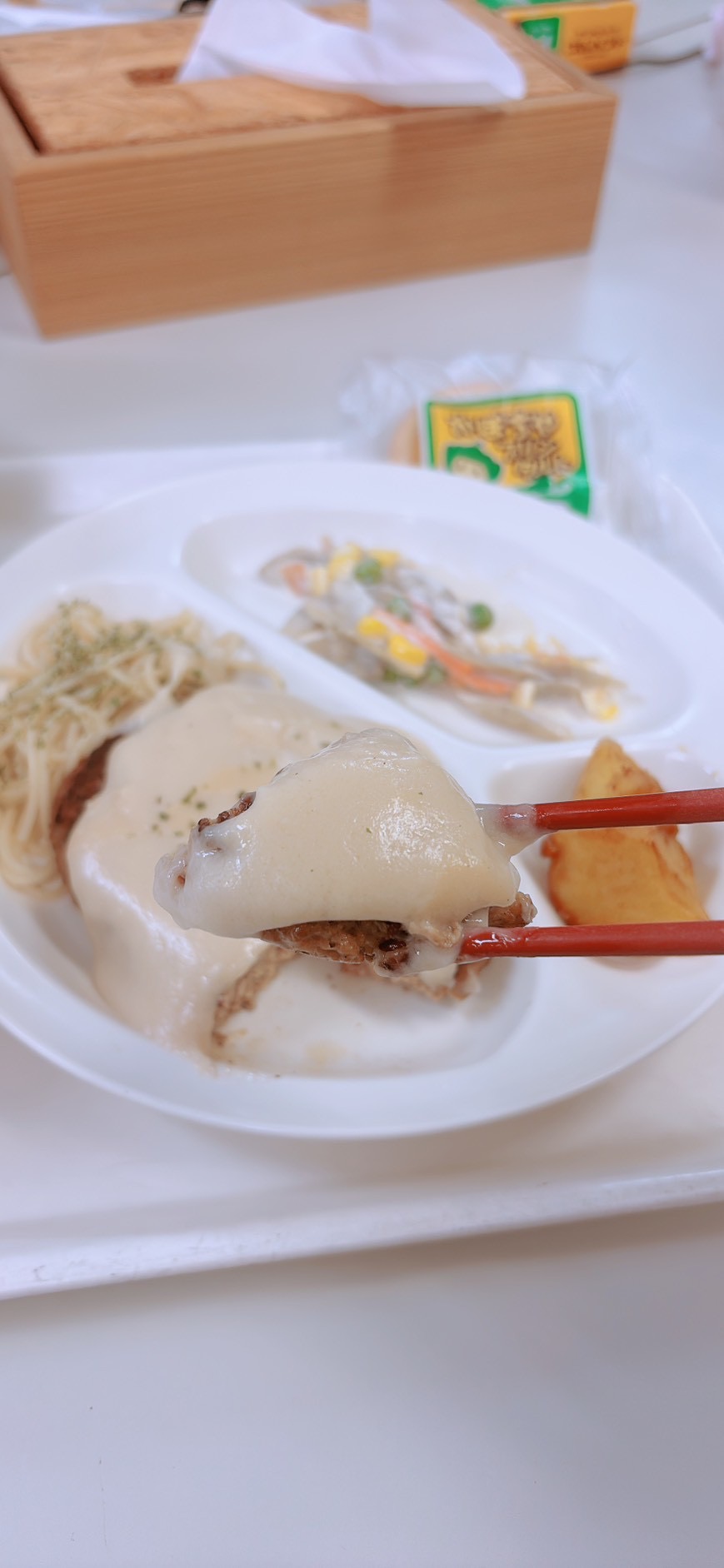 メニューは”ビアンドハンバーグホワイトソースがけ” ”ローストポテト” ”ごぼうサラダ”