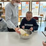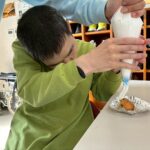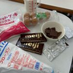 ということで、チョコを使ったカップケーキをつくります。 材料は、ホットケーキミックスとチョコ、卵、生クリームです。