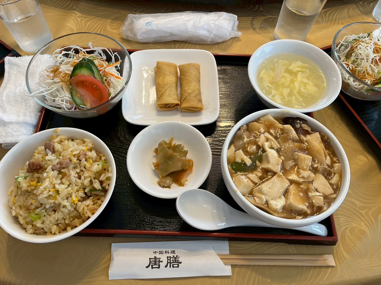 麻婆豆腐に炒飯、サラダ、春巻き、中華スープと豪華✨